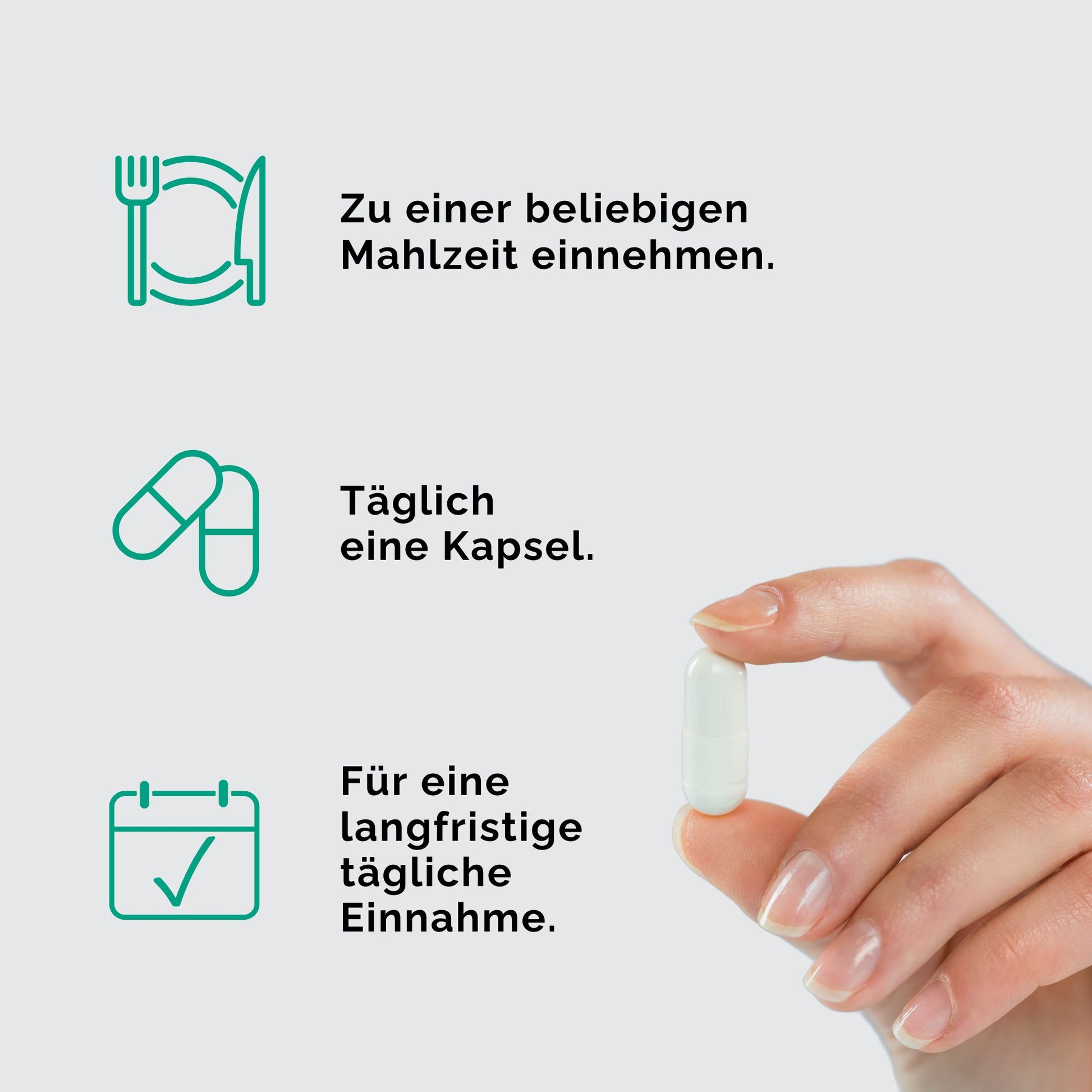 Täglich eine Kapsel mit ausreichend Flüssigkeit zu einer beliebigen Mahlzeit einnehmen.